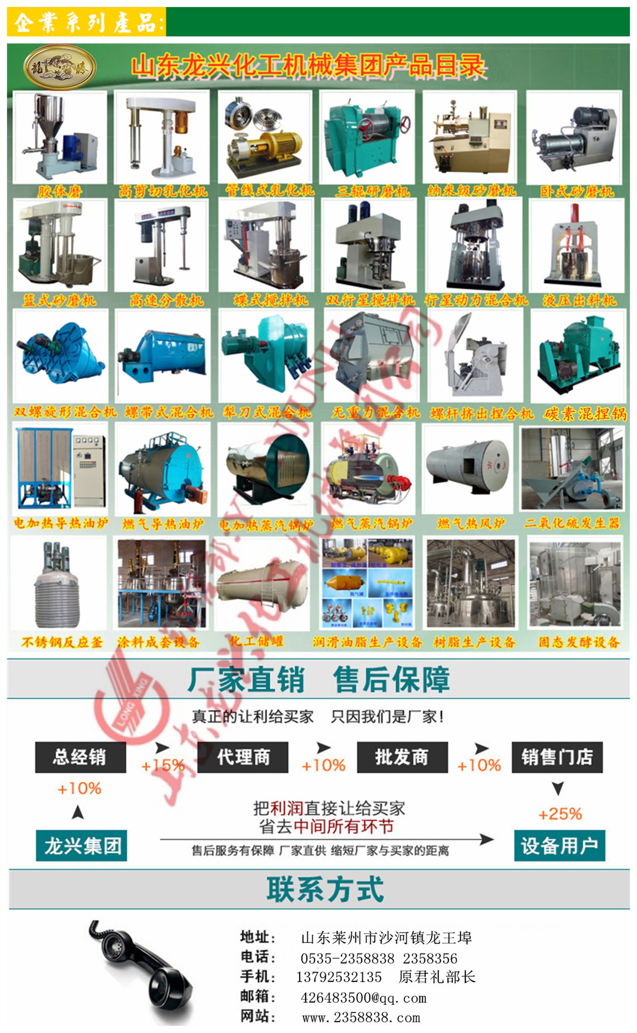 我公 司憑借在業內三十余年的技術積累和成長經歷,已經發展為集科研、開發、制造為一體的科技型集團公司,主要業務涉及 液體研磨機、攪拌分散機,膏體混拌捏合機、雙行星動力攪拌混合機,干粉攪拌混合機,導熱油、蒸汽 鍋爐、反應釜和換熱器及一二三類壓力容器的設計與生產。 同時我們承接行業用戶成套設 備及生產線的設計制造業務,龍興人愿與天下有識之士攜手共創新的輝煌。
