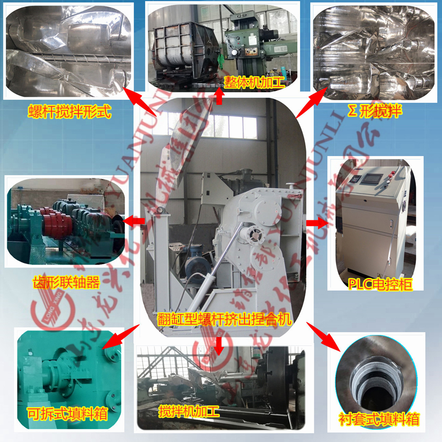 下出料捏合機(jī)主要是由混捏部分、螺 桿擠出部分、機(jī)座部分、液壓系統(tǒng)、傳動(dòng)系統(tǒng)和電控系統(tǒng)等五大部分組成。液壓系統(tǒng)由一臺(tái)液壓站來操 縱大油缸,來完成啟閉功能,液壓系統(tǒng)由一臺(tái)液壓站來操縱油缸,來完成翻缸、啟蓋等功能;傳動(dòng)系統(tǒng)由電動(dòng)機(jī)、減速機(jī)和齒輪組成,實(shí) 現(xiàn)了大扭矩的動(dòng)力輸出,動(dòng)力經(jīng)齒形軸器傳輸出到快漿軸上,使其達(dá)到規(guī)定的轉(zhuǎn)速,也可 由變頻器進(jìn)行調(diào)速。另外該型設(shè)備的具體細(xì)節(jié)配置可根據(jù)用戶工藝靈活搭配。