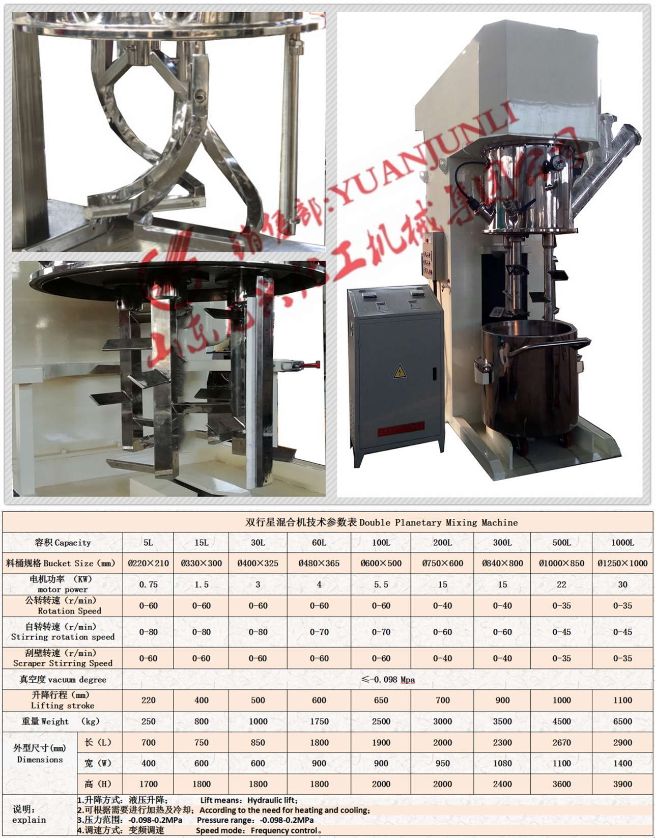 真空型雙行星混合攪拌機適用于化工、輕工、食品、電池漿料、制藥、建材、nong藥等行業所需的多組份固—固相、固—液相、液—液相物料的混合、反應、分散、溶解、調質等工藝,如硅酮密封膠、硅酮結構膠、有機硅油墨、顏料、粘膠劑、密封膠、灌裝膠軟膏、糊狀物料、潤滑脂、油漆、膏狀化妝品、膏狀食品、添加物等多種高粘稠物的制備。使用粘度范圍1-5萬厘泊左右。攪拌器的形式,根據物料要求可為多層槳葉式、框式、蝶式、渦輪式等 。